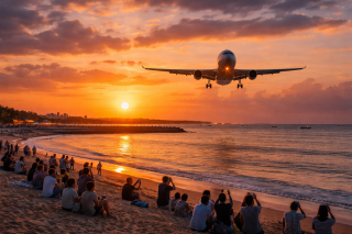 Perpaduan antara cahaya jingga matahari terbenam, siluet pesawat, dan garis pantai menciptakan komposisi visual yang sangat epik. Tak heran jika foto dan video dengan latar ini sering viral di media sosial.