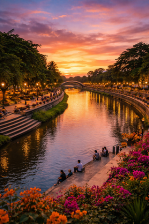 Langit perlahan berubah warna, dari biru cerah menjadi jingga keemasan. Perpaduan ini menciptakan latar yang sempurna bagi siapa saja yang ingin menikmati ketenangan di tengah kota.