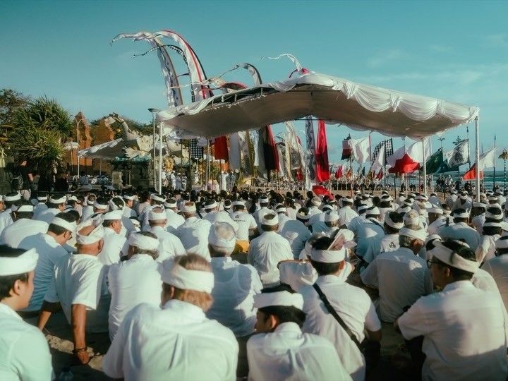 Selanjutnya, Momen Sakral Melasti Bali melibatkan pengarakan berbagai pratima atau benda suci dari pura masing-masing desa. Iring-iringan ini berjalan perlahan menuju bibir pantai di bawah naungan tenda putih yang elegan. Akibatnya, pemandangan di pesisir Kelating berubah menjadi hamparan putih yang sangat estetik dan spiritual. Umat duduk bersila di atas pasir sambil melantunkan doa-doa suci ke hadapan Ida Sang Hyang Widhi Wasa. Akhirnya, seluruh prosesi ini memberikan kesiapan batin yang matang sebelum memasuki masa hening Nyepi.