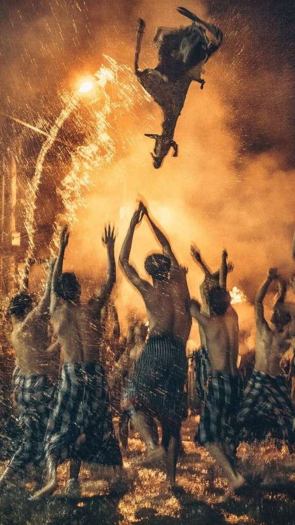 Suasana ritual semakin terasa magis karena diiringi oleh suara kentongan atau kulkul desa yang bertalu-talu. Selain itu, penerangan utama hanya berasal dari daun kelapa kering yang dibakar. Oleh karena itu, kilatan cahaya api menciptakan bayangan-bayangan dramatis yang sesuai dengan nama tradisi ini.