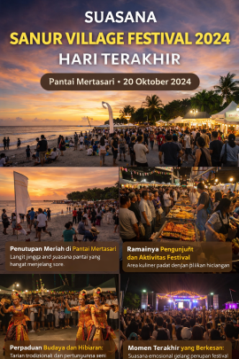 Suasana sanur village festival di hari terakhir terasa begitu hidup saat digelar di Pantai Mertasari pada 20 Oktober 2024. Sejak sore hari, pengunjung mulai berdatangan untuk menikmati momen penutup yang penuh kesan.