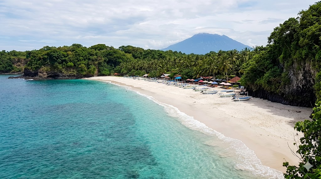 Pantai Virgin di Karangasem dikenal sebagai salah satu pantai dengan pemandangan yang memukau di Bali. Salah satu spot terbaik untuk menikmatinya adalah dari atas, di mana hamparan laut dan garis pantai terlihat lebih luas.
