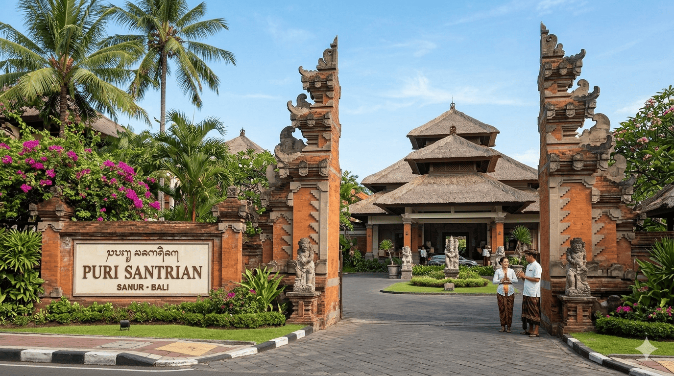 Area depan Puri Santrian menjadi salah satu spot menarik yang sering dilewatkan wisatawan saat berkunjung ke Sanur. Padahal, lokasi ini menawarkan suasana khas Bali yang tenang, elegan, dan sangat cocok untuk menikmati waktu santai atau sekadar berburu foto estetik.