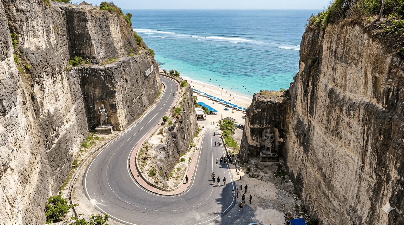 Namun sekarang, akses menuju pantai ini sudah sangat mudah dan justru menjadi daya tarik utama. Saat memasuki kawasan pantai, pengunjung akan disambut dengan jalan yang membelah tebing kapur besar, menciptakan pemandangan dramatis yang sangat memukau. Rasanya seperti memasuki dunia eksklusif yang hanya bisa dinikmati oleh mereka yang tahu tempat terbaik.