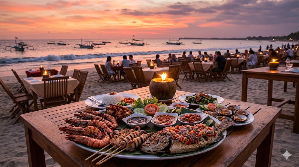 Daya tarik utama Jimbaran Beach adalah restoran seafood di tepi pantai. Pengunjung bisa memilih ikan, udang, atau cumi segar, lalu dimasak sesuai selera. Menikmati hidangan laut sambil duduk di pasir, ditemani suara ombak, menjadi pengalaman kuliner yang tidak terlupakan.