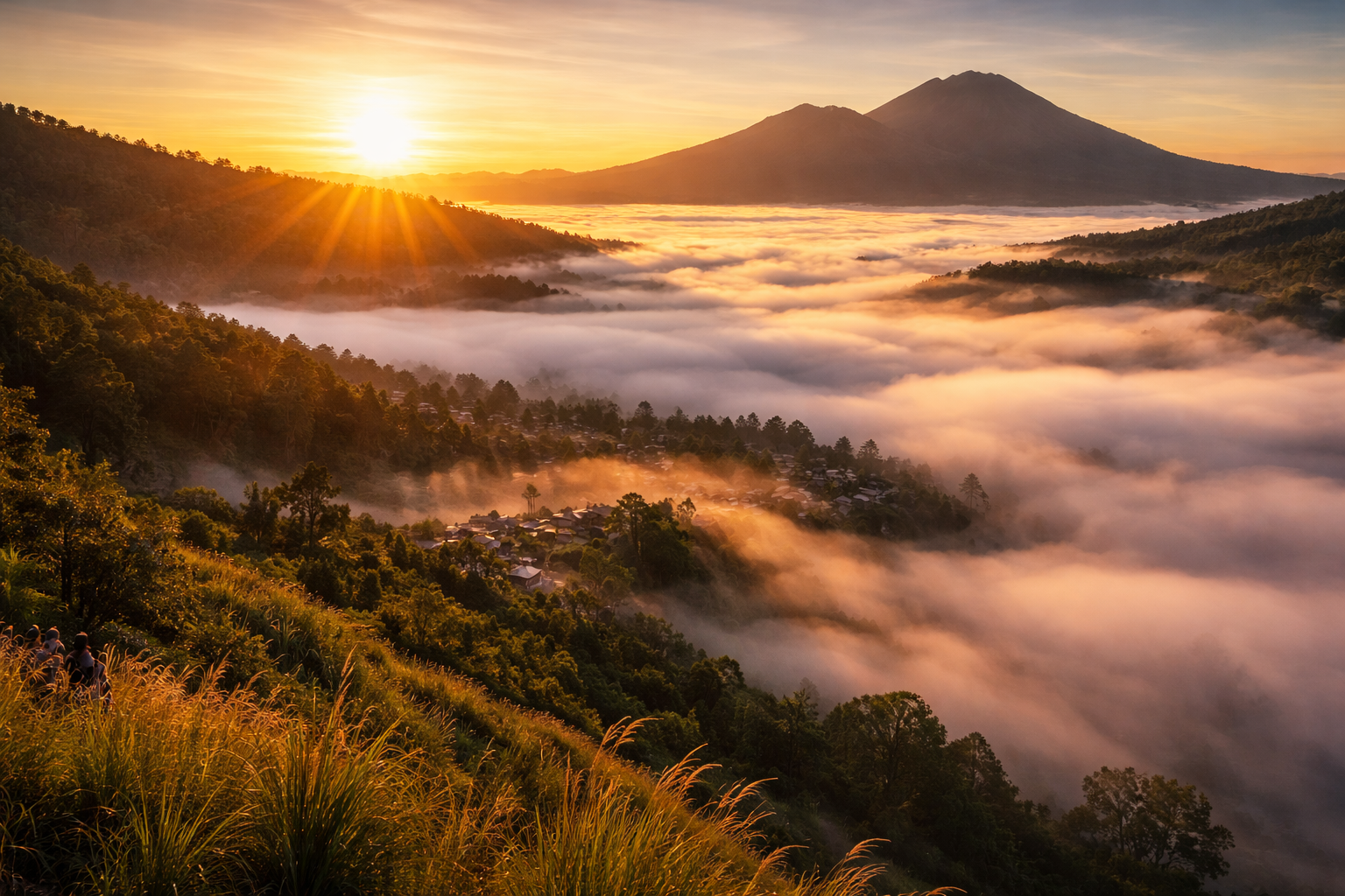 Selain awan, sunrise di Desa Pinggan juga menjadi daya tarik utama. Saat matahari perlahan naik, cahaya lembut menyelimuti langit dan awan, menciptakan gradasi warna yang indah.Gunung di sekitar kawasan Kintamani juga turut mempercantik pemandangan. Kombinasi antara pegunungan, kabut, dan cahaya pagi menjadikan suasana terasa sangat magis dan menenangkan.