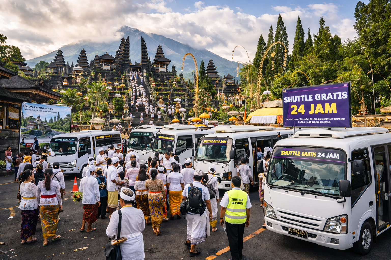 Shuttle gratis Besakih menjadi salah satu fasilitas penting yang disediakan untuk mendukung kelancaran rangkaian karya suci di Pura Agung Besakih. Layanan ini hadir untuk membantu para pemedek yang datang dari berbagai daerah agar dapat mencapai area pura dengan lebih mudah dan nyaman.Dengan adanya fasilitas ini, akses menuju kawasan utama menjadi lebih tertata. Pemedek tidak perlu khawatir mengenai kemacetan atau keterbatasan parkir, karena transportasi telah diatur secara sistematis.