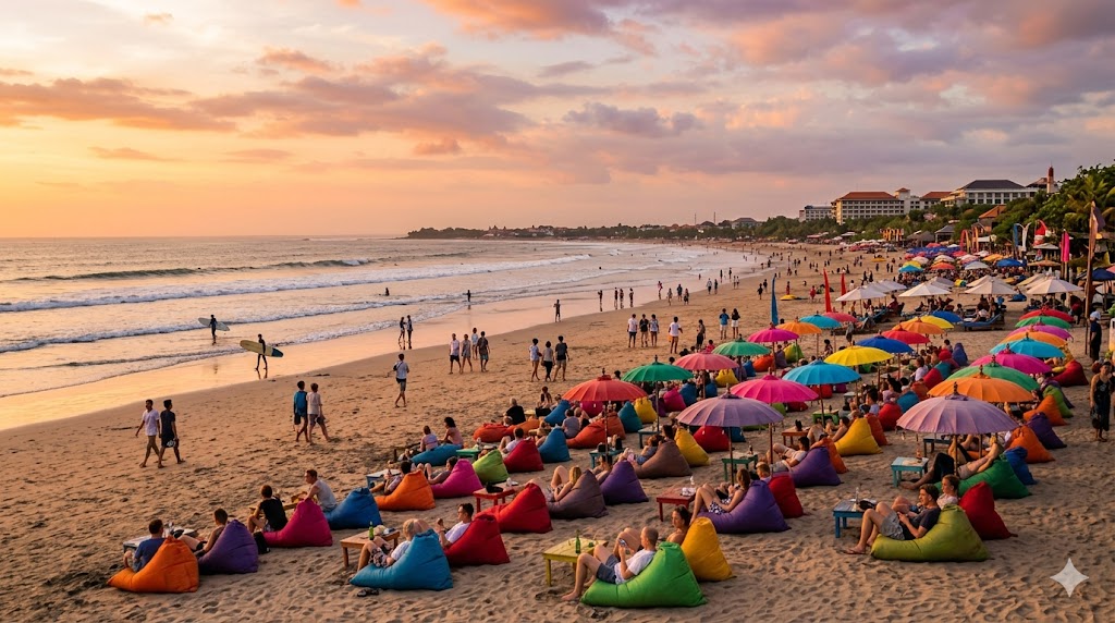 Area pantai yang luas memungkinkan pengunjung memilih spot terbaik untuk melihat sunset. Duduk di pasir atau menikmati minuman dari kafe sekitar menjadi pilihan yang populer. Suasana semakin hidup dengan kehadiran wisatawan yang menikmati waktu bersama.