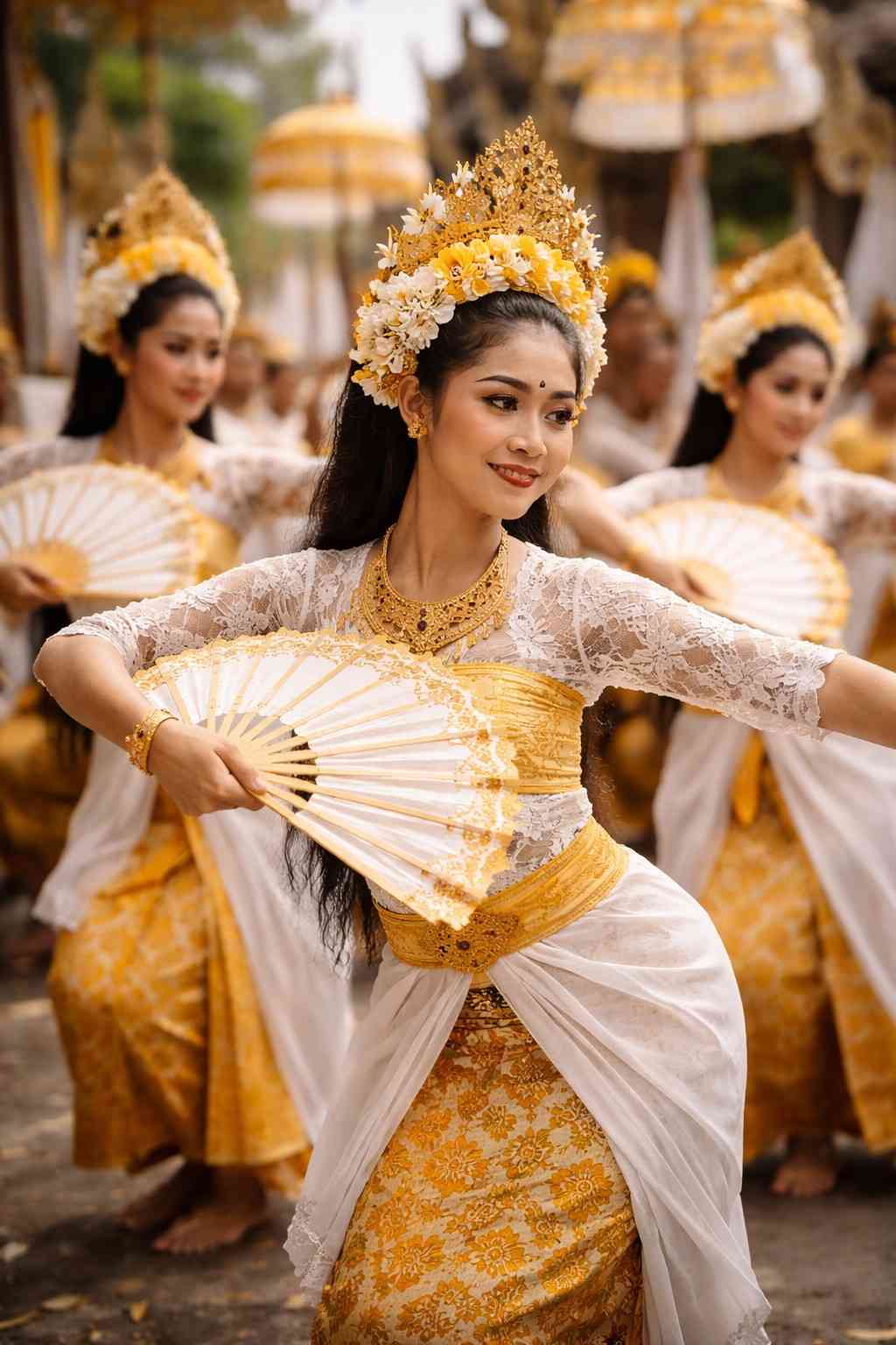 Ayunan kipas yang selaras menciptakan visual yang menenangkan sekaligus memperkuat nuansa sakral dalam pementasan.