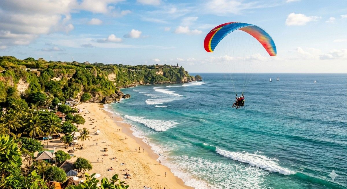 2. Paralayang (Paragliding): Di bagian atas tebing, sebelum menuruni tangga, sering terdapat aktivitas paralayang. Anda bisa melihat orang-orang terbang melintasi langit biru dengan pemandangan laut dari ketinggian.