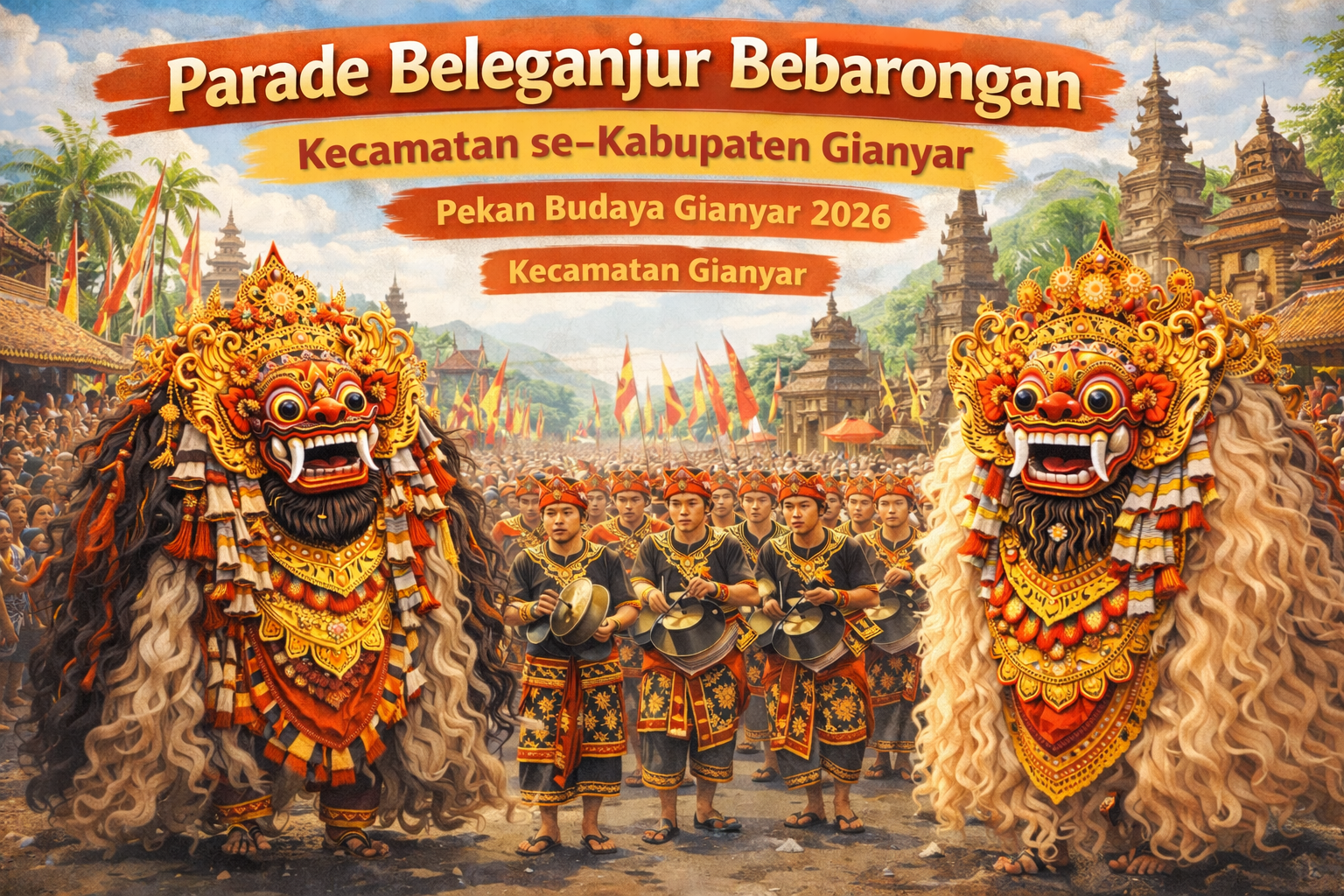 Parade beleganjur bebarongan menjadi salah satu penampilan paling dinanti dalam rangkaian Pekan Budaya Gianyar 2026. Bertempat di Kecamatan Gianyar, acara ini menghadirkan berbagai sekaa dari seluruh kecamatan yang tampil dengan penuh semangat dan kreativitas tinggi.Sejak pagi hari, pusat kota Gianyar sudah dipenuhi oleh masyarakat yang ingin menyaksikan kemeriahan parade. Suara gamelan beleganjur yang menggema berpadu dengan gerakan dinamis dari barong menciptakan suasana yang meriah sekaligus sakral. Dengan demikian, kegiatan ini tidak hanya menjadi hiburan, tetapi juga bentuk pelestarian budaya Bali yang masih kuat hingga saat ini.