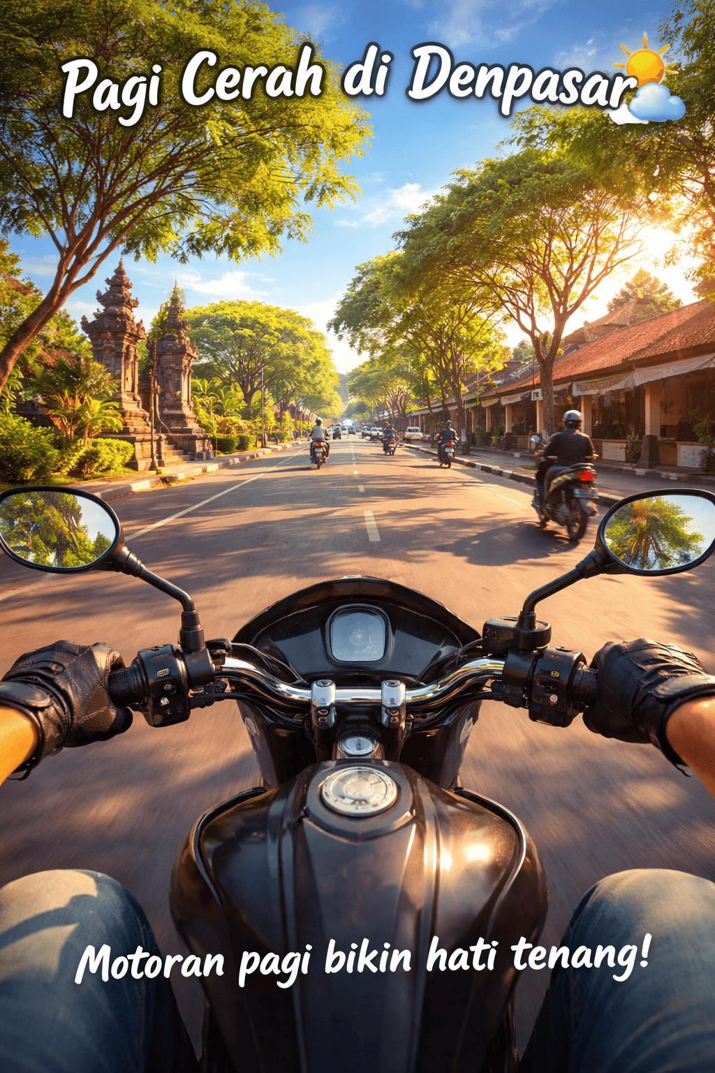 Motoran pagi di Denpasar selalu punya daya tarik tersendiri. Saat matahari mulai muncul perlahan dan langit berubah menjadi biru cerah, suasana kota terasa lebih hidup namun tetap menenangkan. Udara yang masih segar berpadu dengan semilir angin pagi menciptakan pengalaman berkendara yang sulit untuk dilewatkan.