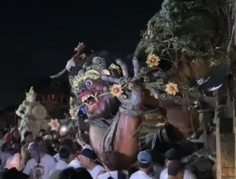 Karya seni rupa ini menarik perhatian banyak pasang mata karena detail anatominya yang tampak sangat hidup dan sangat nyata. Para pemuda dari Banjar Buda Ireng terlihat sangat teliti dalam merapikan setiap bagian hiasan serta aksesoris yang terpasang. Proses pemindahan menuju Alun-alun Gianyar dilakukan dengan sangat hati-hati agar tidak merusak bagian kecil pada struktur bangunan patung. Hal ini menunjukkan dedikasi yang sangat tinggi dari para seniman muda dalam menjaga kualitas karya seni tradisional Bali. Pengunjung yang melintas di sekitar panggung Rijing tampak berhenti sejenak untuk mengagumi keindahan visual dari instalasi seni tersebut.