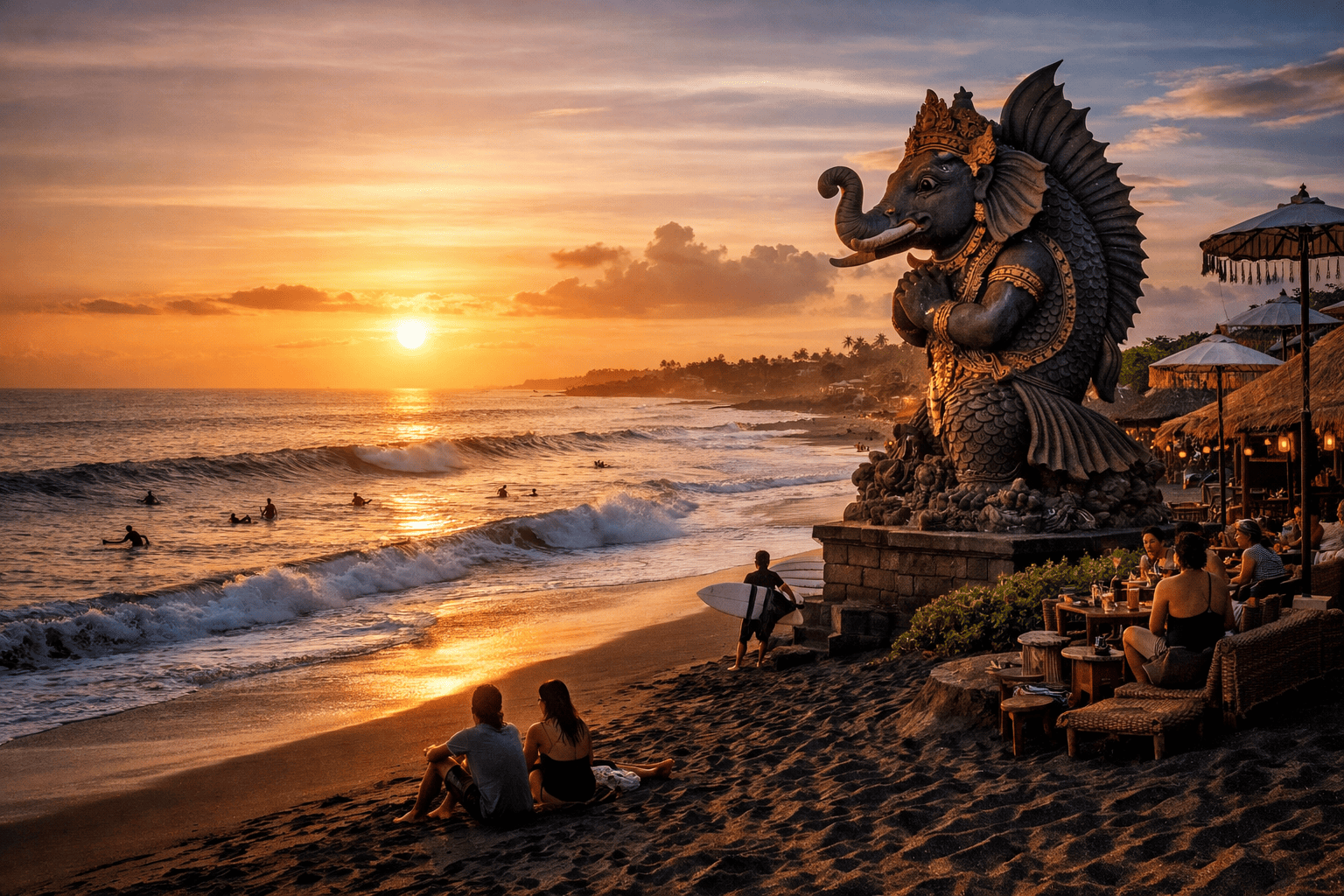 Salah satu daya tarik utama yang membedakan pantai ini adalah keberadaan Patung Gajah Mina. Ikon ini tidak hanya menjadi spot foto menarik, tetapi juga mencerminkan nilai budaya dan spiritual masyarakat Bali.