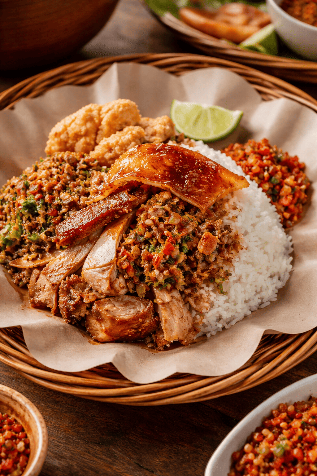 Pelengkap seperti lawar, sambal khas Bali, dan nasi hangat semakin memperkaya rasa. Kombinasi ini menghadirkan pengalaman kuliner yang autentik tanpa harus pergi jauh ke daerah pedesaan Bali.
