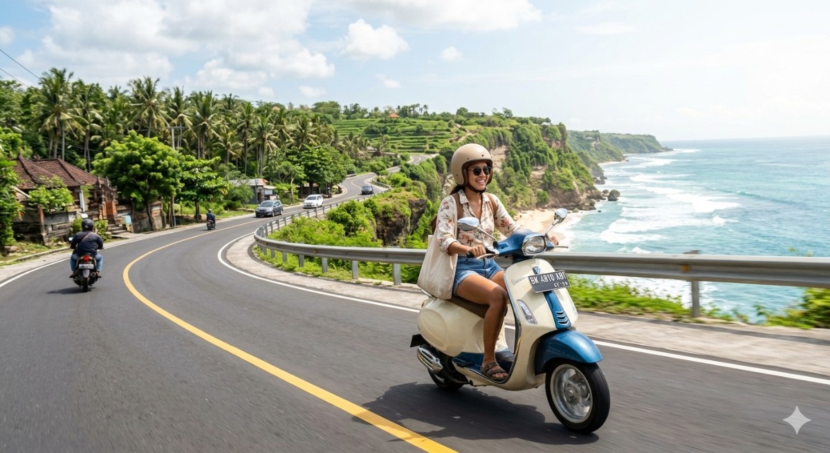 Skuter telah menjadi identitas transportasi bagi para pelancong di Bali karena kepraktisannya. Dengan menggunakan skuter, Anda bisa dengan mudah masuk ke gang-gang kecil atau jalan setapak di tengah sawah yang tidak bisa dijangkau oleh mobil. Hal ini memungkinkan Anda menemukan kafe estetik atau pantai rahasia yang jauh dari keramaian turis pada umumnya.