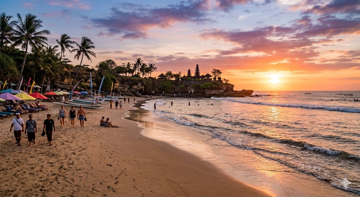 - Bali Barat (Kuta & Seminyak): Memiliki garis pantai yang sangat panjang dan landai. Wilayah ini adalah tempat terbaik untuk melihat matahari terbenam (sunset).