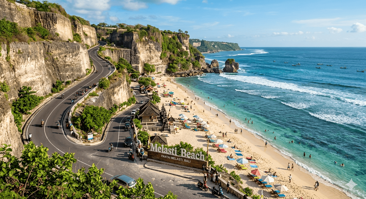 Salah satu hal yang membuat pesona pantai melasti bali begitu istimewa adalah akses jalannya. Berbeda dari pantai lain, pengunjung akan melewati jalan berkelok di antara tebing kapur tinggi yang menjulang. Pemandangan ini sering dijadikan spot foto karena terlihat sangat megah dan unik.