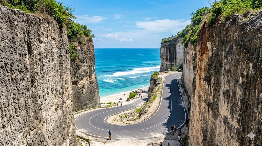 Berbeda dengan pantai lain, pengalaman di sini dimulai dari perjalanan masuknya. Jalan yang panjang di antara tebing menciptakan kesan seperti lorong alami.