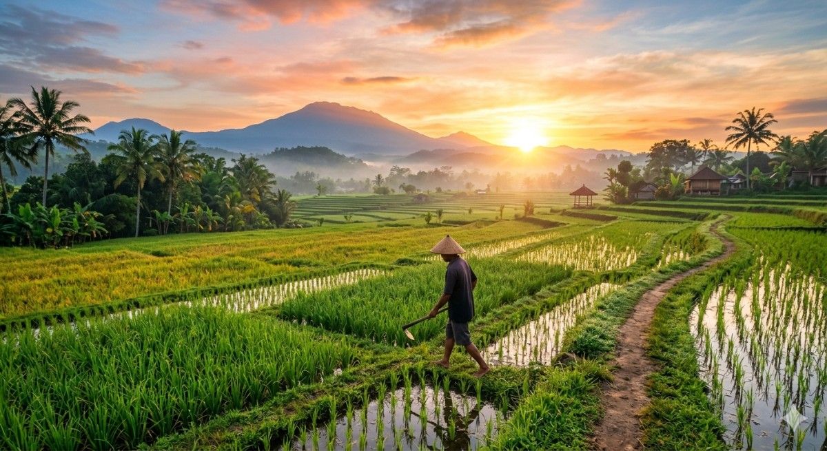 - Cahaya Pagi yang Estetik: Sinar matahari yang baru muncul menciptakan bayangan pohon kelapa yang indah di atas permukaan air sawah.