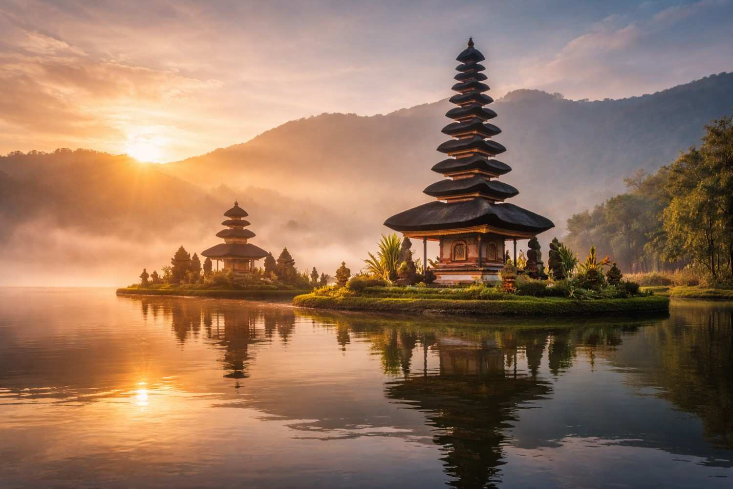 Saat matahari mulai muncul di ufuk timur, Pura Ulun Danu Bratan perlahan terbangun dalam suasana yang tenang dan penuh keanggunan. Cahaya pagi menyelimuti pura, menciptakan pemandangan yang lembut dan menenangkan.