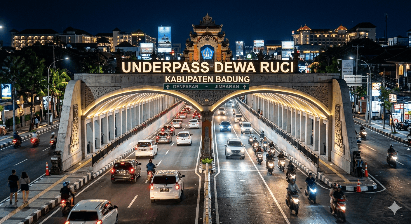 Underpass dewa ruci malam menghadirkan suasana berbeda dari wajah Bali yang biasanya identik dengan pantai dan budaya tradisional. Saat malam tiba, kawasan ini berubah menjadi lanskap urban yang penuh cahaya, menciptakan kesan modern dan dinamis di Kabupaten Badung.