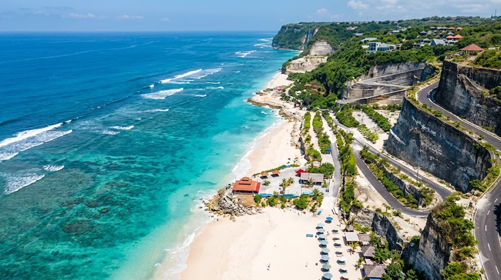 Pantai Melasti di kawasan Ungasan, Bali tidak hanya menarik dari area pasirnya. Dari atas tebing, pemandangan terlihat jauh lebih luas dan dramatis. Banyak pengunjung justru berhenti di bagian atas untuk menikmati view sebelum turun ke pantai.