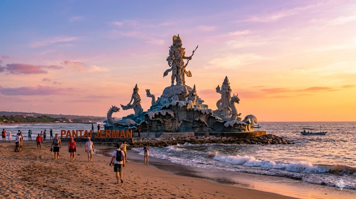 Patung ikon Pantai Jerman Bali menjadi salah satu daya tarik unik di kawasan pantai tersebut. Kehadirannya memberikan nilai artistik dan simbolik yang menarik bagi pengunjung.