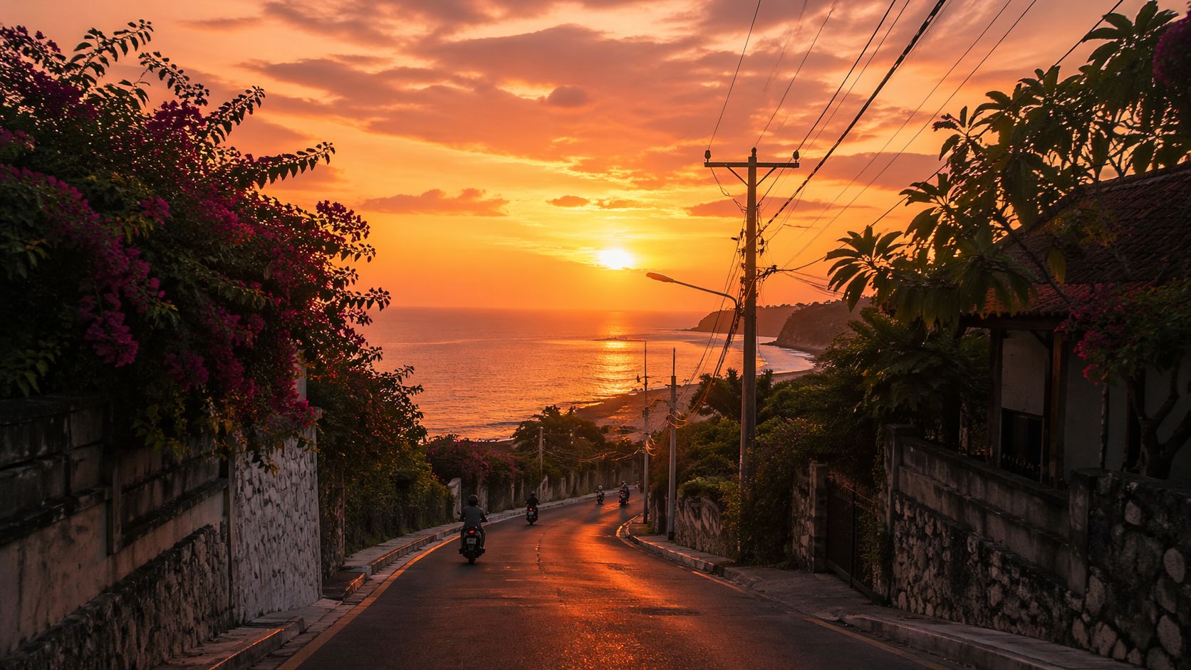 Sunset di jalan menuju Pantai Kelan Bali menawarkan pemandangan yang sangat indah. Langit senja dengan warna jingga yang dramatis sering membuat suasana terasa seperti di film.