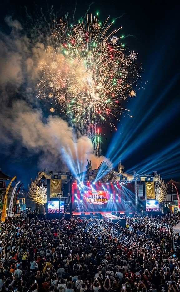 Momen yang paling dinantikan oleh ribuan pasang mata adalah pertunjukan kembang api raksasa. Tepat pada waktu yang ditentukan, langit malam Gianyar yang gelap pekat berubah menjadi kanvas yang menyala. Letupan warna-warni kembang api yang megah menghiasi angkasa (seperti diabadikan dalam foto), menciptakan visual yang sangat spektakuler. Gemuruh tepuk tangan dan sorakan kebahagiaan dari lautan manusia membahana, menyatu dengan suara letupan kembang api di udara. Momen ini menjadi penutup yang sempurna untuk serangkaian acara yang panjang dan penuh makna.