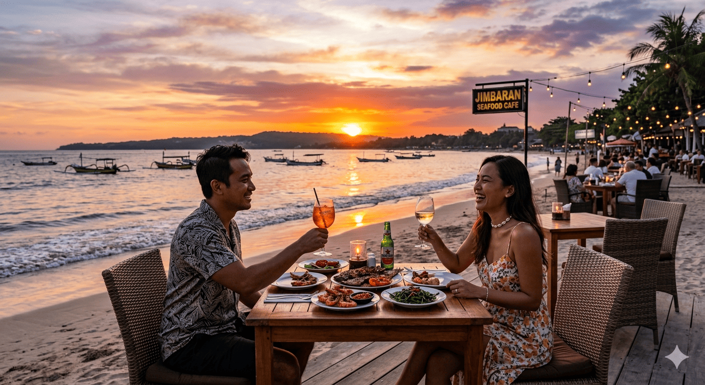 Salah satu hal yang membuat pengalaman di Jimbaran semakin istimewa adalah deretan restoran seafood di tepi pantai. Meja yang ditata langsung di atas pasir memberikan sensasi makan malam yang berbeda. Pengunjung dapat menikmati hidangan laut segar sambil ditemani pemandangan sunset yang memukau.