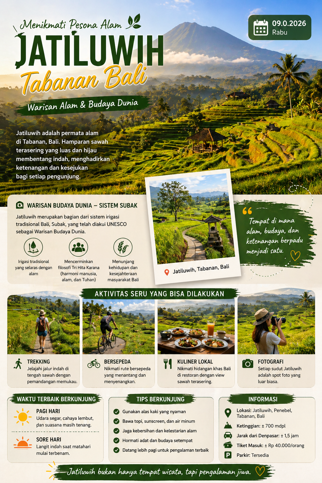 Jatiluwih di Kabupaten Tabanan dikenal sebagai salah satu destinasi wisata alam paling indah di Bali. Hamparan sawah terasering yang luas membentang sejauh mata memandang, menciptakan pemandangan hijau yang begitu memanjakan mata.