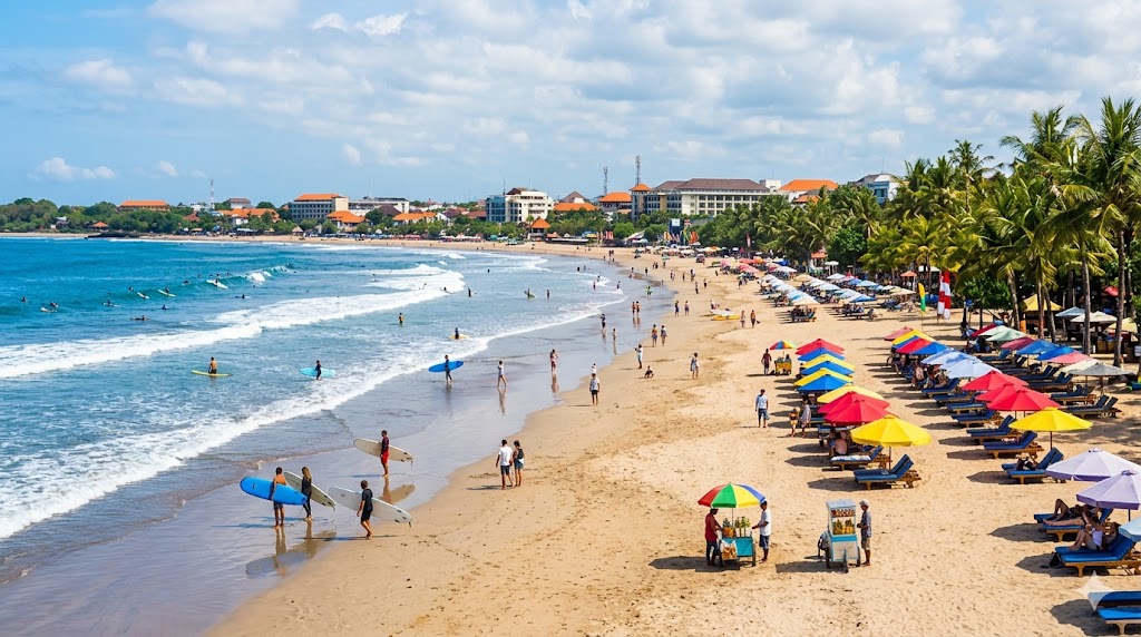 Pantai Kuta di Bali tetap menjadi destinasi favorit meskipun dikunjungi saat siang hari. Cuaca yang cerah membuat area pantai terlihat lebih terang dengan warna laut dan langit yang kontras. Suasana ini memberikan pengalaman visual yang berbeda dibandingkan pagi atau sore.