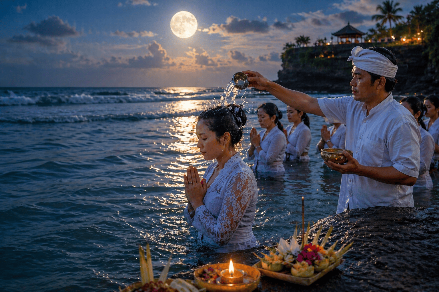 Purnama memiliki makna khusus dalam kepercayaan Hindu Bali. Fase bulan penuh ini dianggap sebagai waktu terbaik untuk melakukan pembersihan spiritual karena energi alam berada pada titik yang kuat. Melukat di pantai Bali saat purnama dipercaya mampu memperkuat proses penyucian diri, baik secara fisik maupun batin.