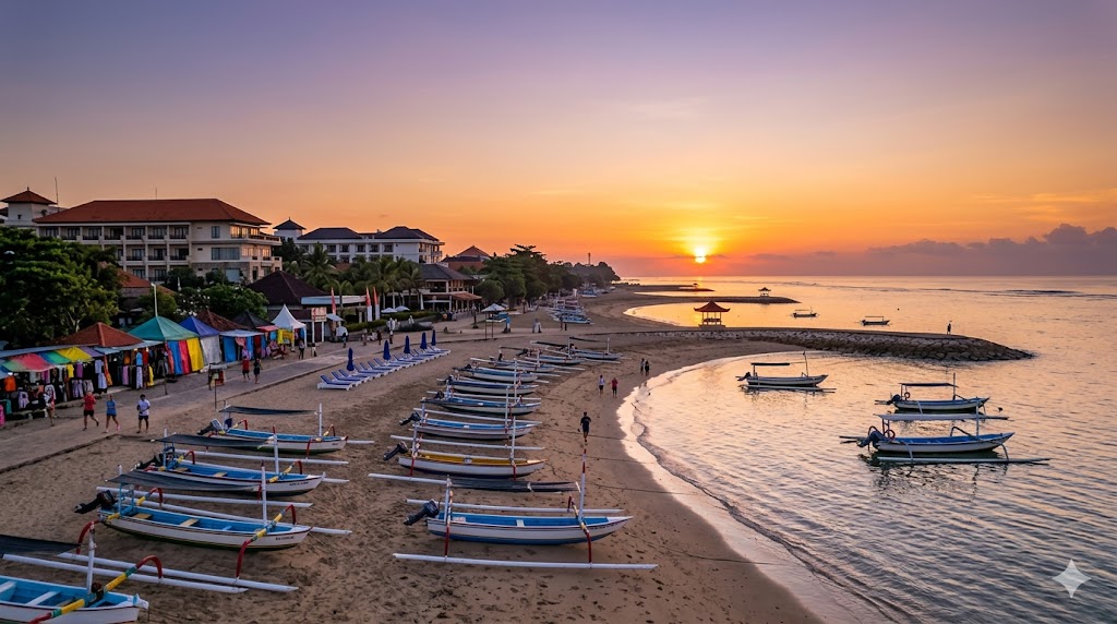 Pantai Sindhu di kawasan Sanur, Bali pada pagi hari menawarkan suasana yang nyaman untuk memulai aktivitas. Cuaca yang cerah membuat pemandangan laut terlihat jelas dengan langit yang terbuka.