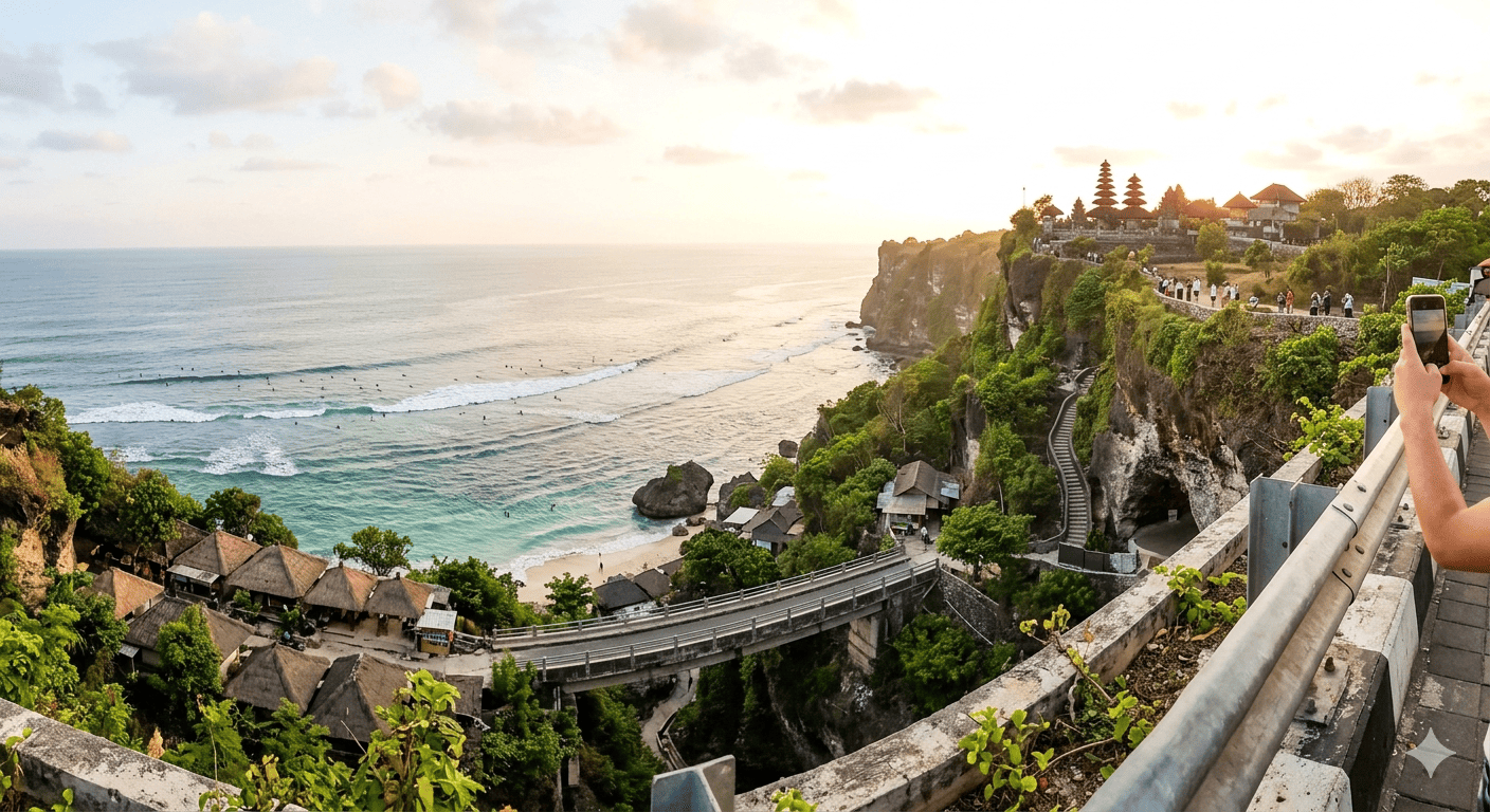 Tidak sedikit orang yang akhirnya berhenti sejenak hanya untuk mengabadikan momen. View jembatan Labuansait Uluwatu menjadi salah satu spot foto spontan yang justru terlihat autentik. Tidak ada tiket masuk, tidak ada keramaian berlebihan—hanya kamu dan lanskap alam yang menawan.